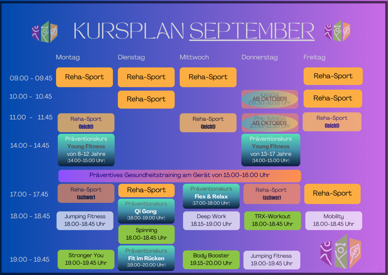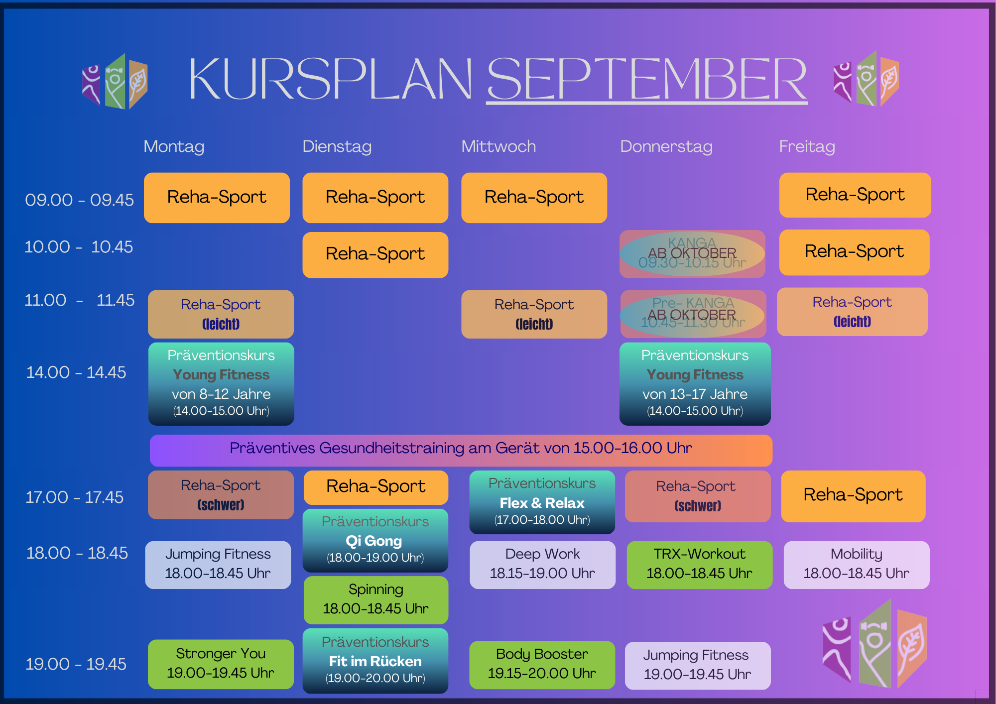 Kursplan September/Oktober 2025 Gesundheitspark 30/06/2025 0 Comments CategoryAktuelles Like Tweet Write a comment: Cancel replyMessageName * Email * Your email address will not be published. Save my name, email, and website in this browser for the next time I comment.